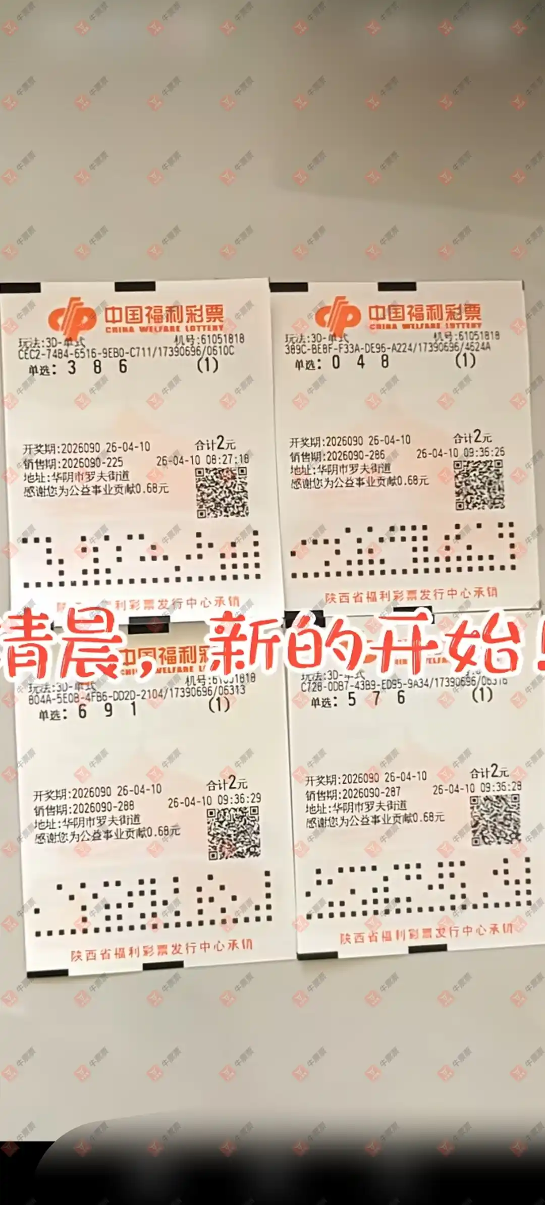 福彩开机号763 体彩开机号640 福彩推荐号五码复式74295 单挑一注745 今日继续不考虑组合云南孟连县912 陕西随机号386 048 691 576 还有山东济宁汶上路通花园 晒票 目前没看到看到 昨天347 一个号也没有 我看到以后 第一时间发在这里 大家参考杀号用 2026年4月10号