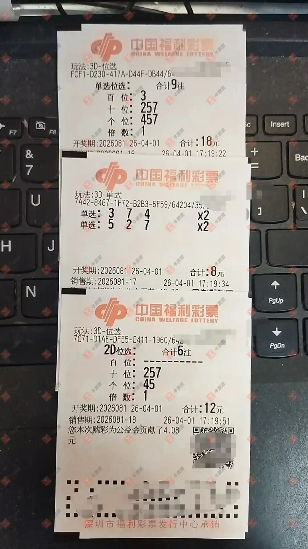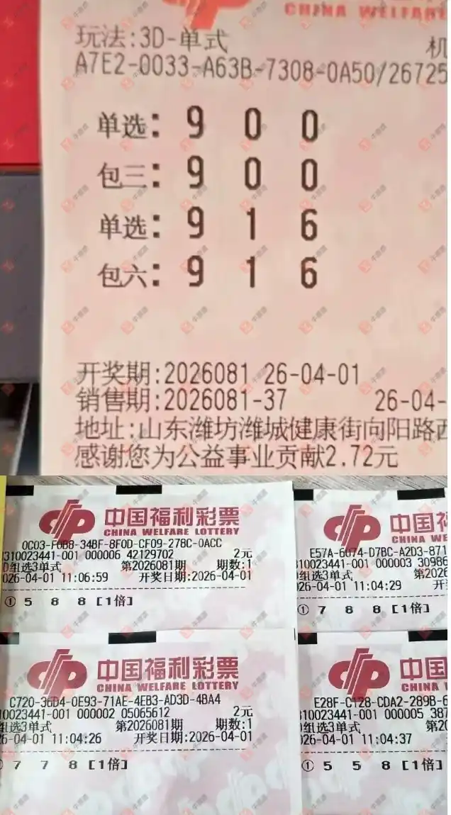 提醒大家本票 本票辽宁省福利彩票中心某个网点 他这个是守号 云南省孟连县912 811 中奖概率非常低 他是几个朋友一块每天都打 几十倍 不像某个软件上网友说打几千倍 福彩推荐号五码复式52743 单挑一注743 2026年4月1号