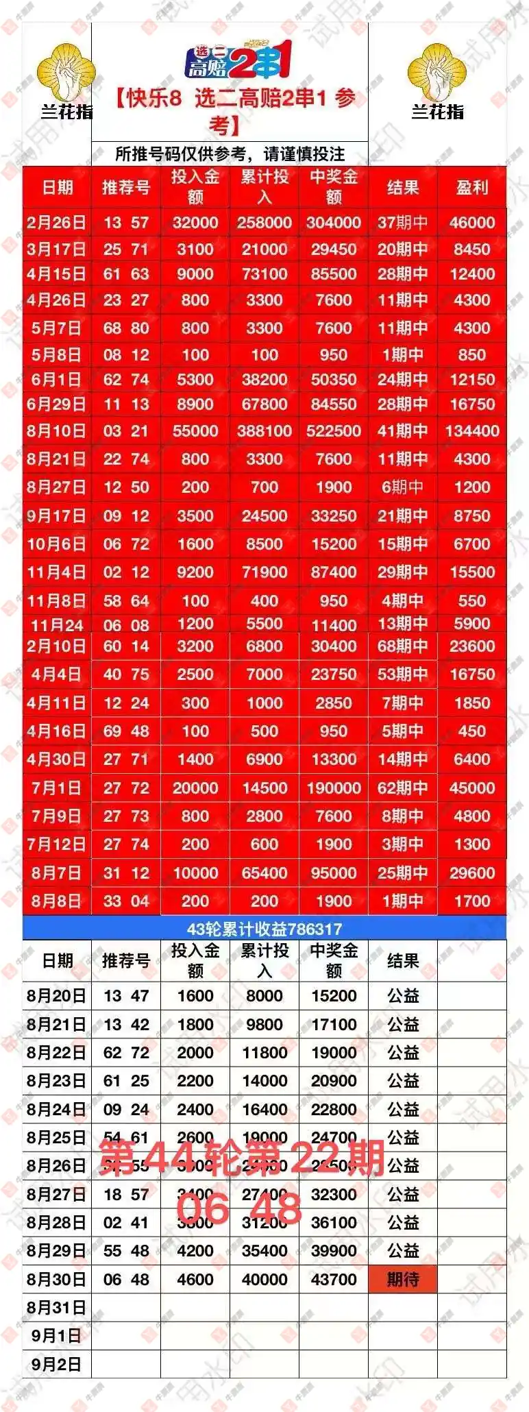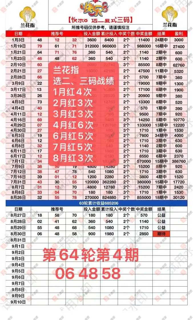 犀牛快8两码目前是61 03计划第16天,兰花指两码06 48计划第22天。