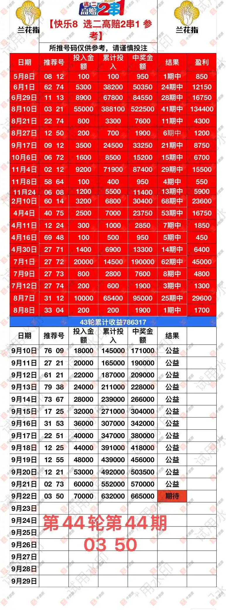 犀牛快8两码39 26计划第12天,兰花指两码03 50计划第44天。