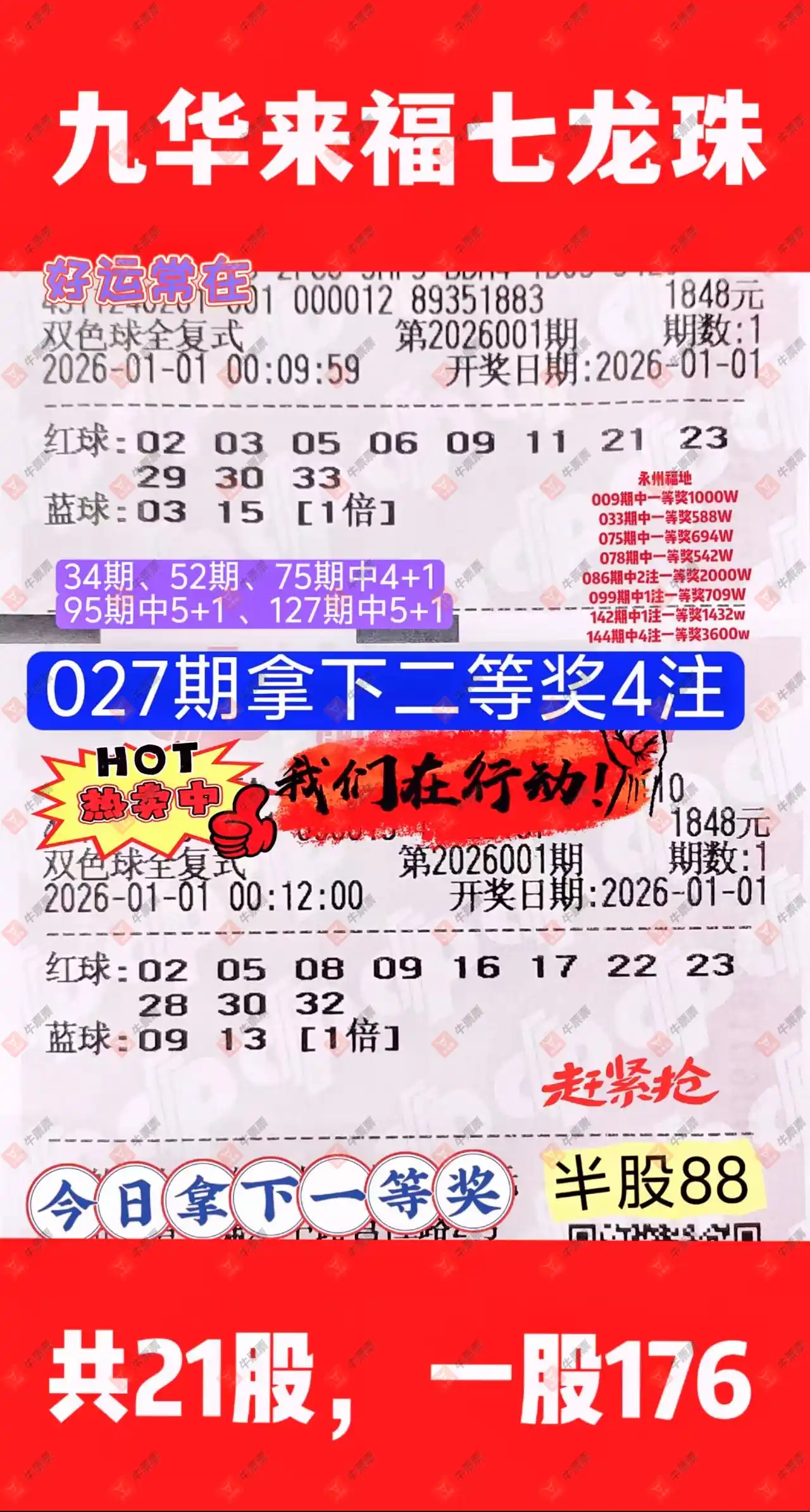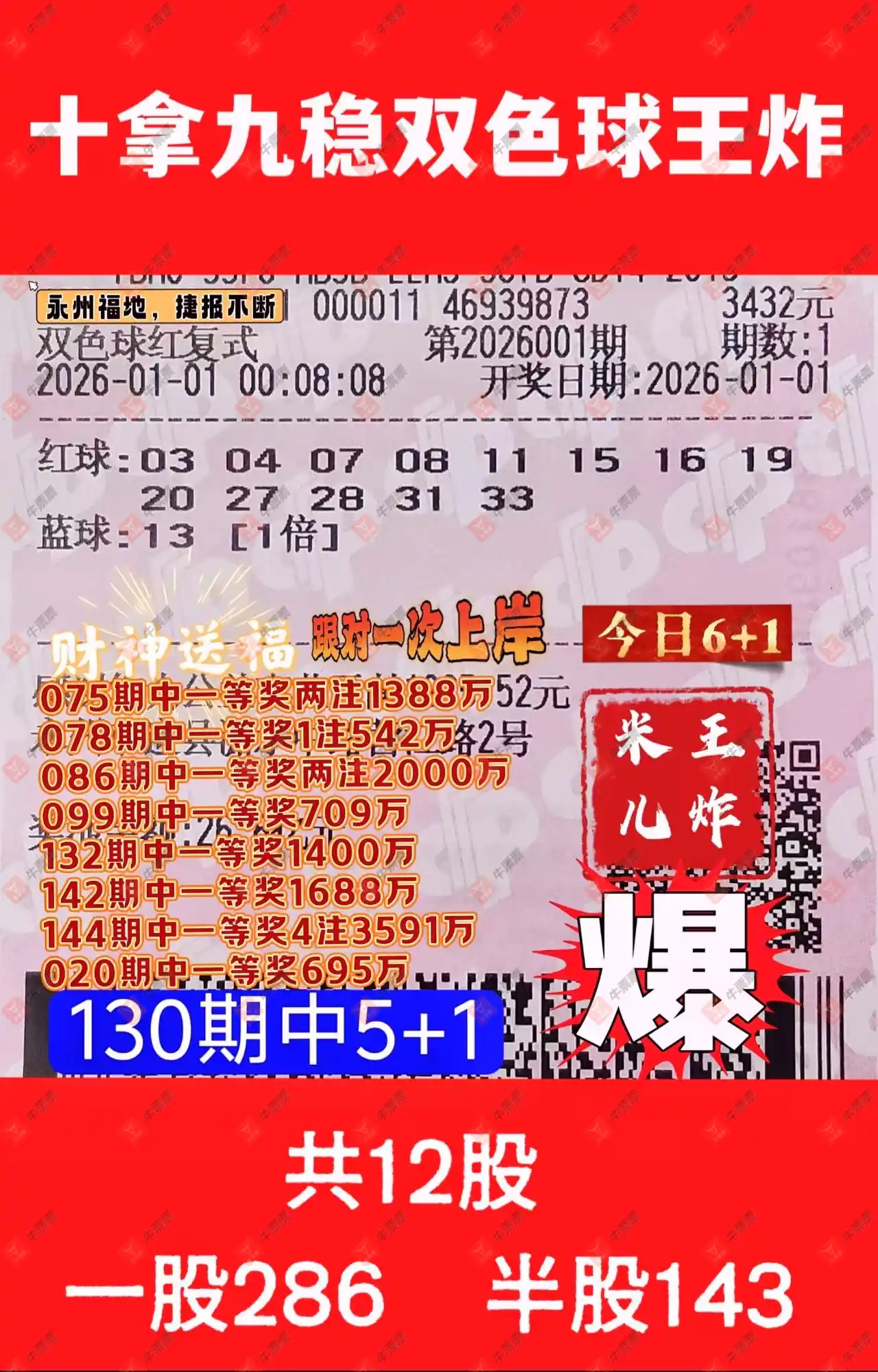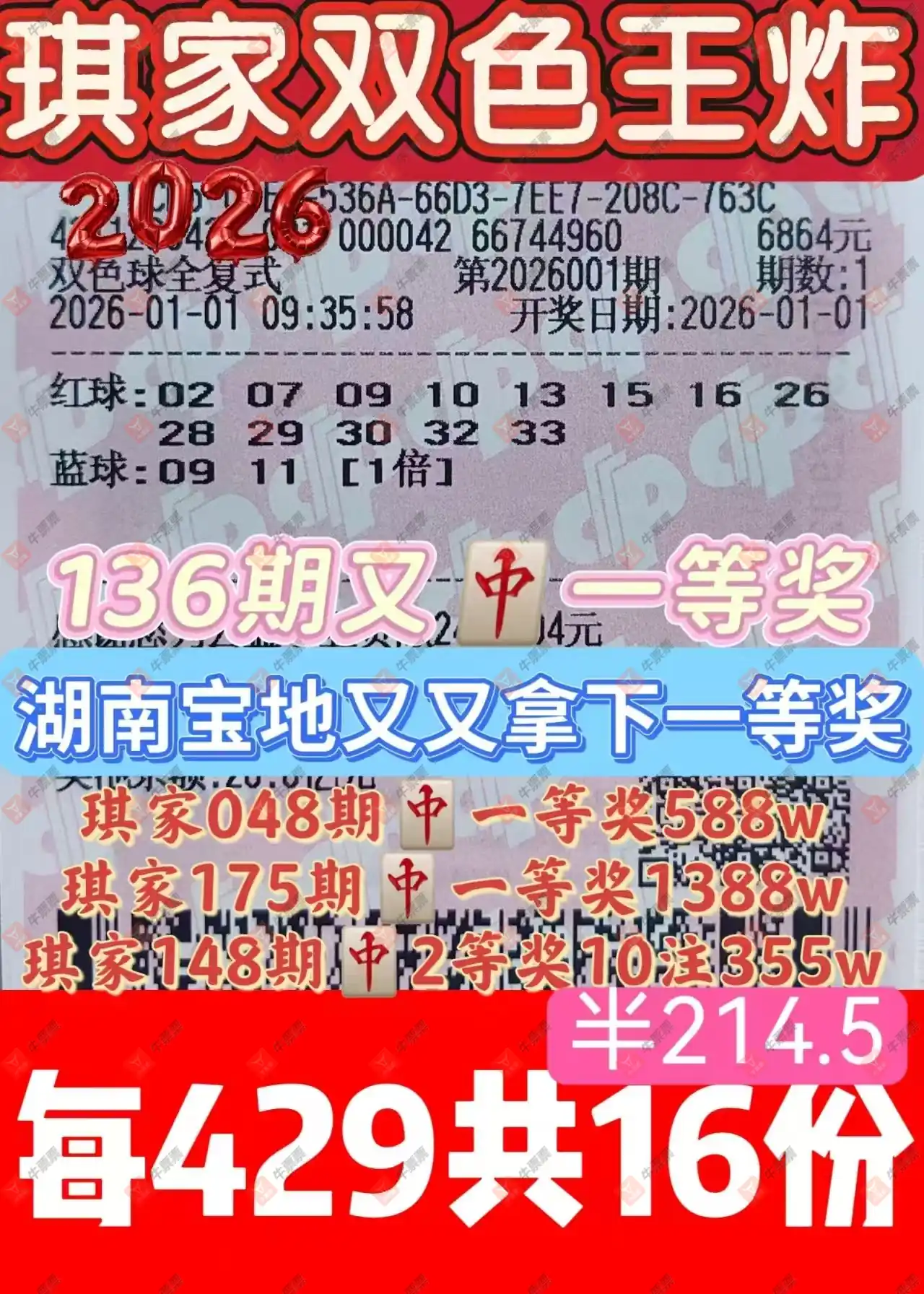 晒中001期双色球合买票