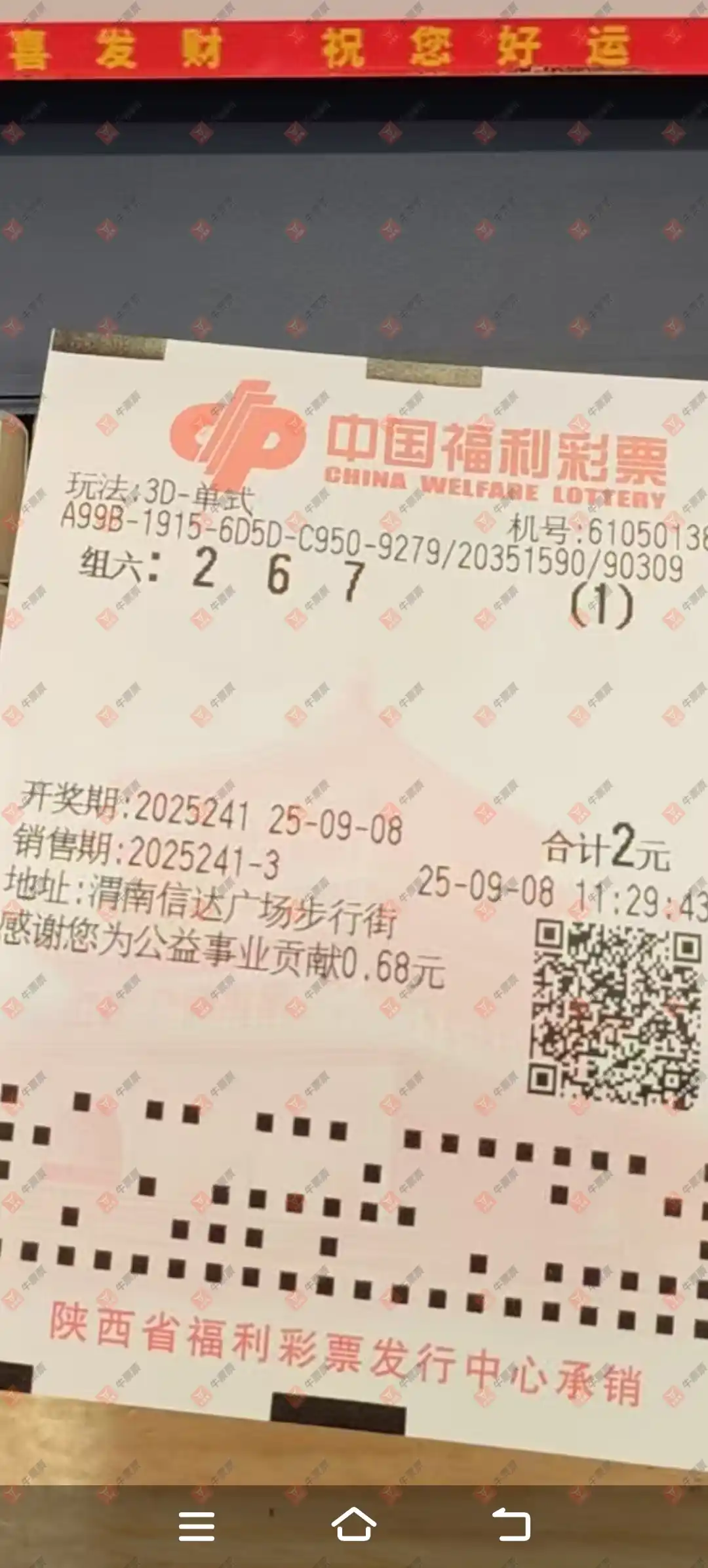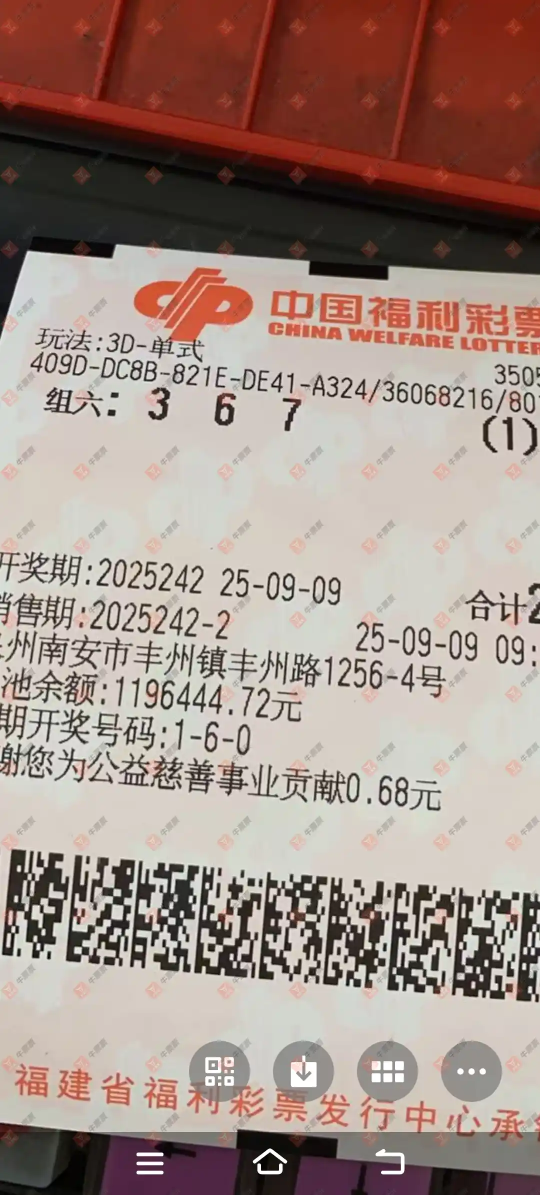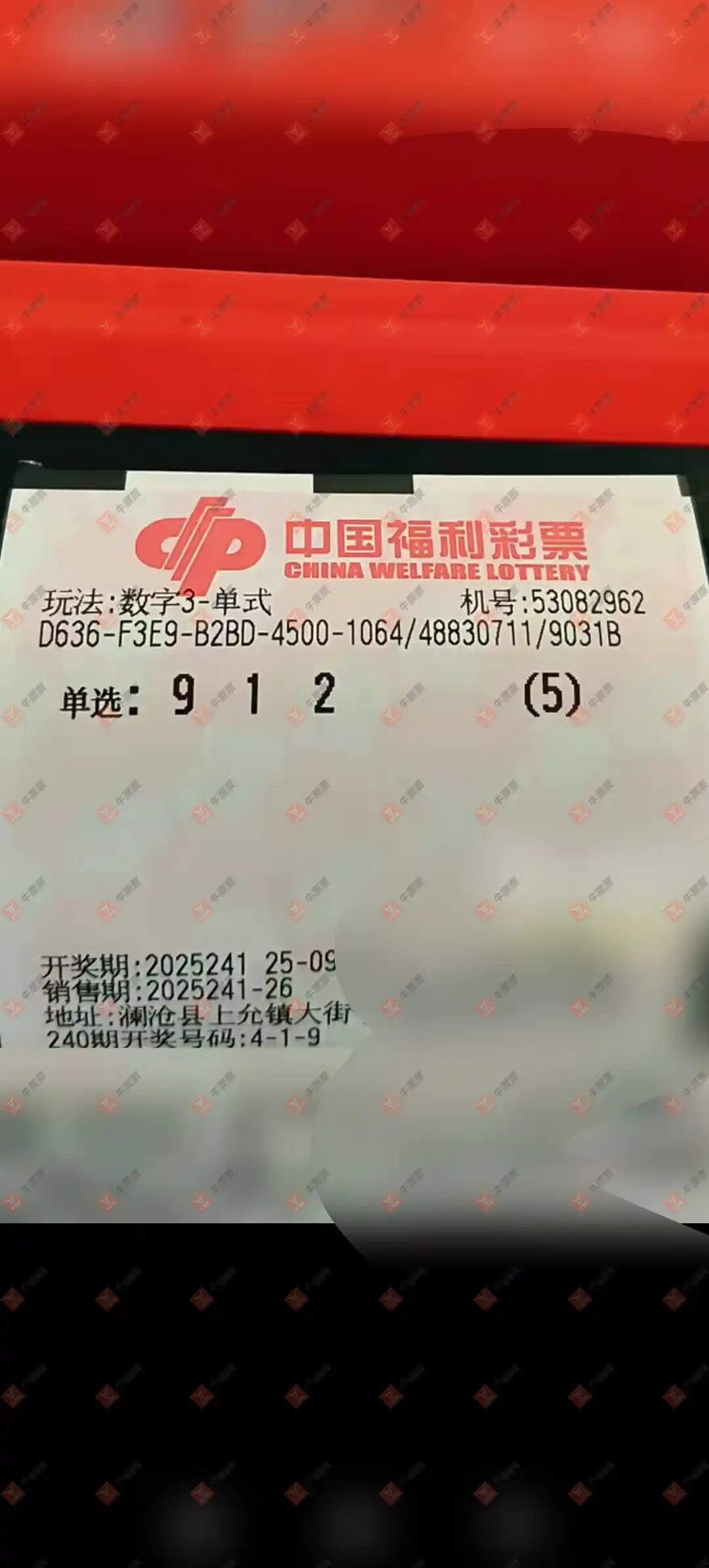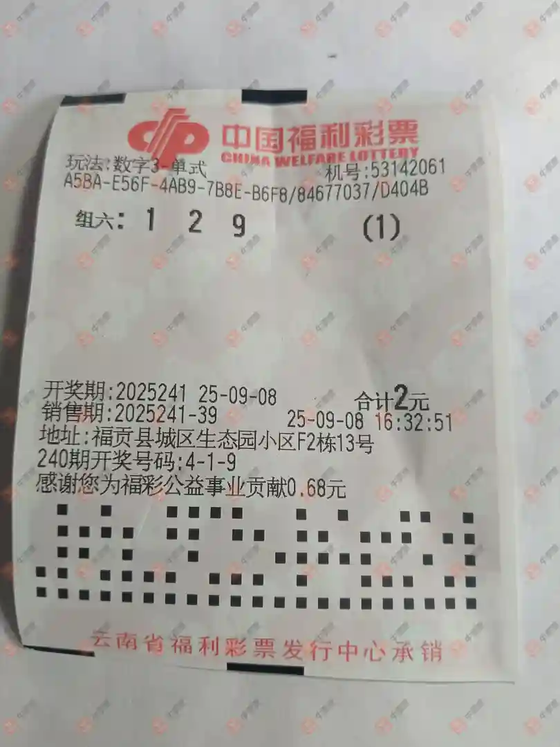 福彩3D 2025241期 晒中