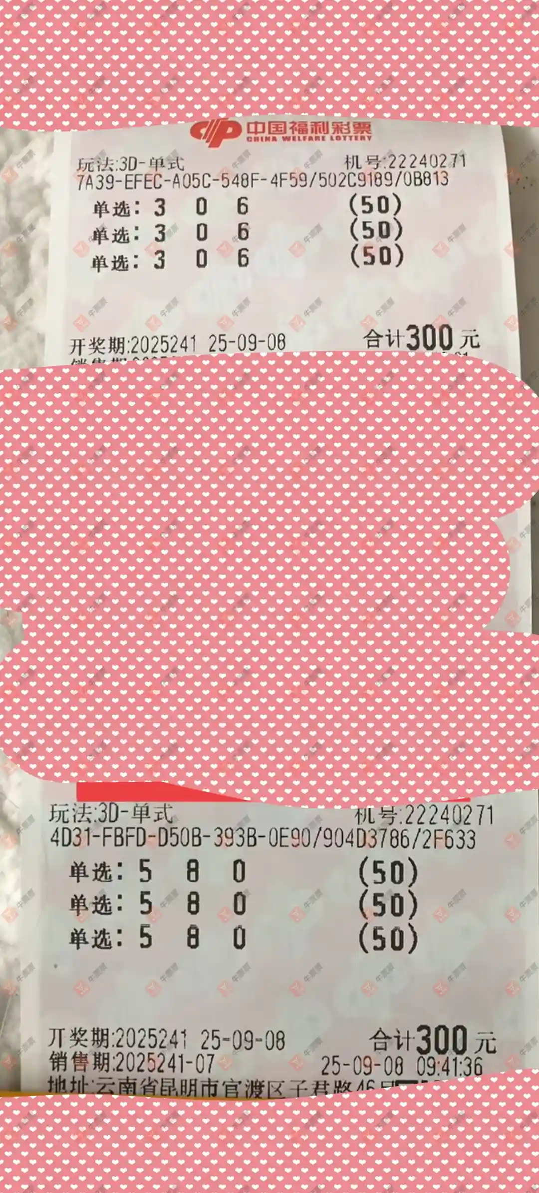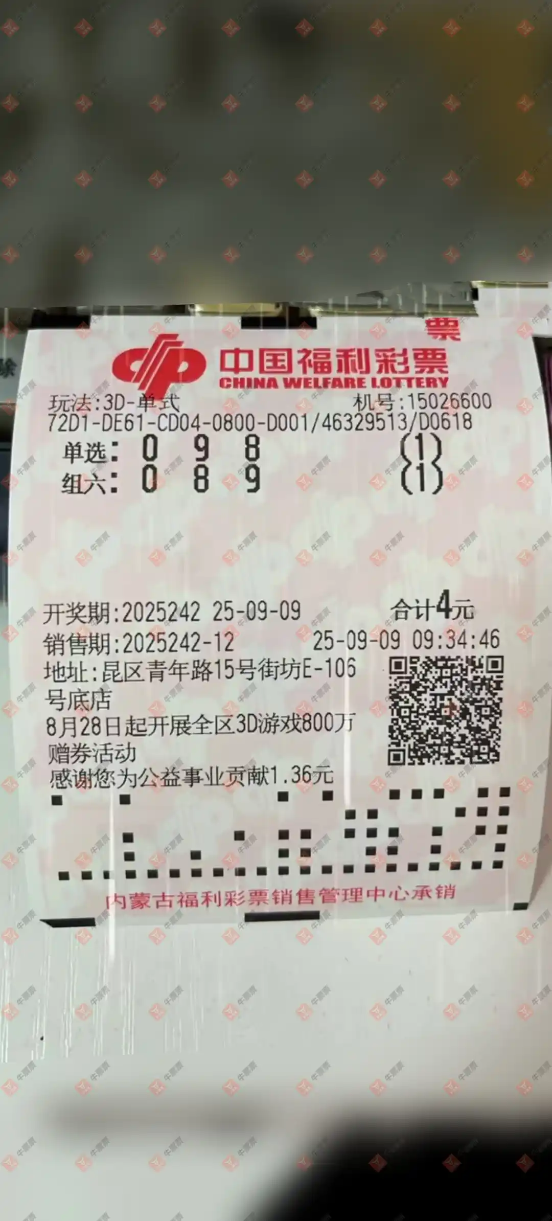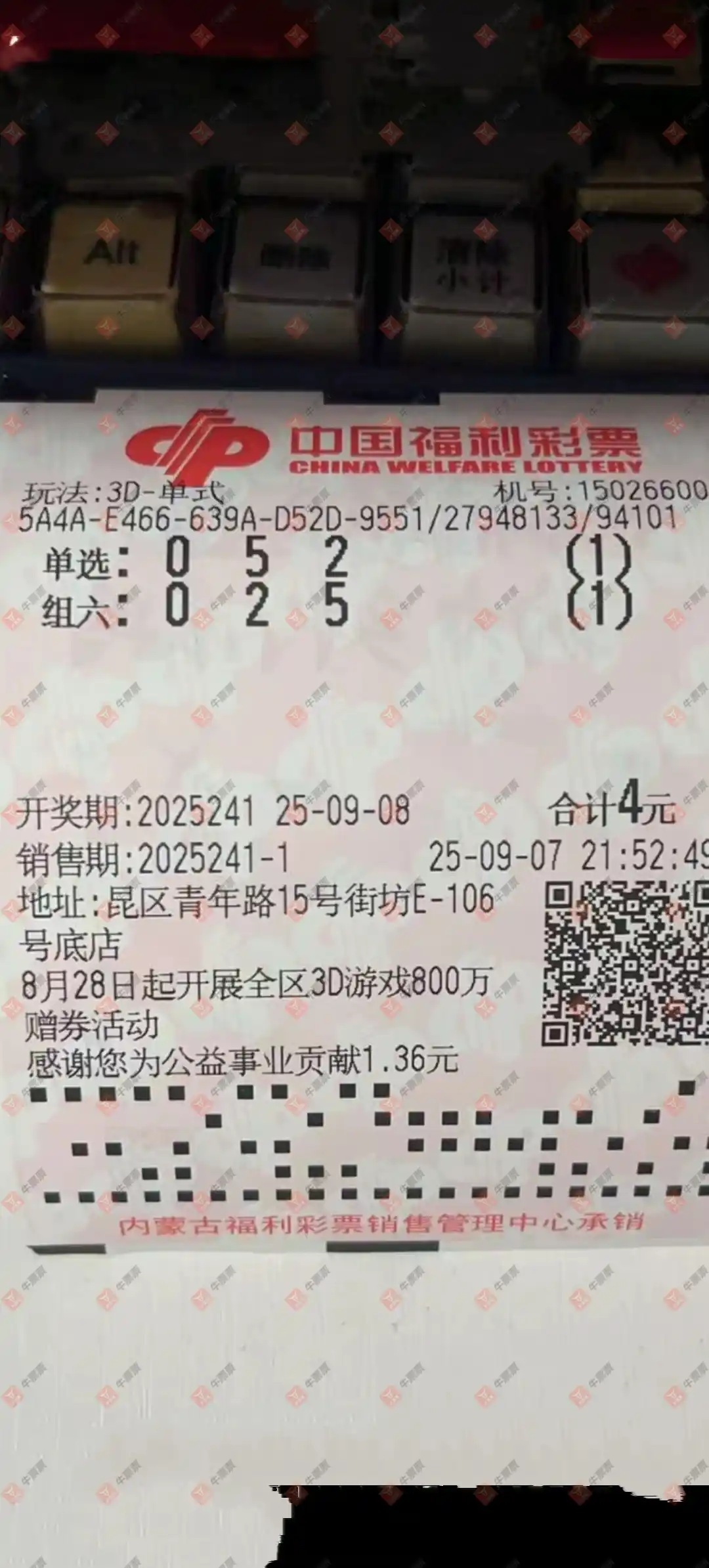 福彩3D 2025241期 晒中