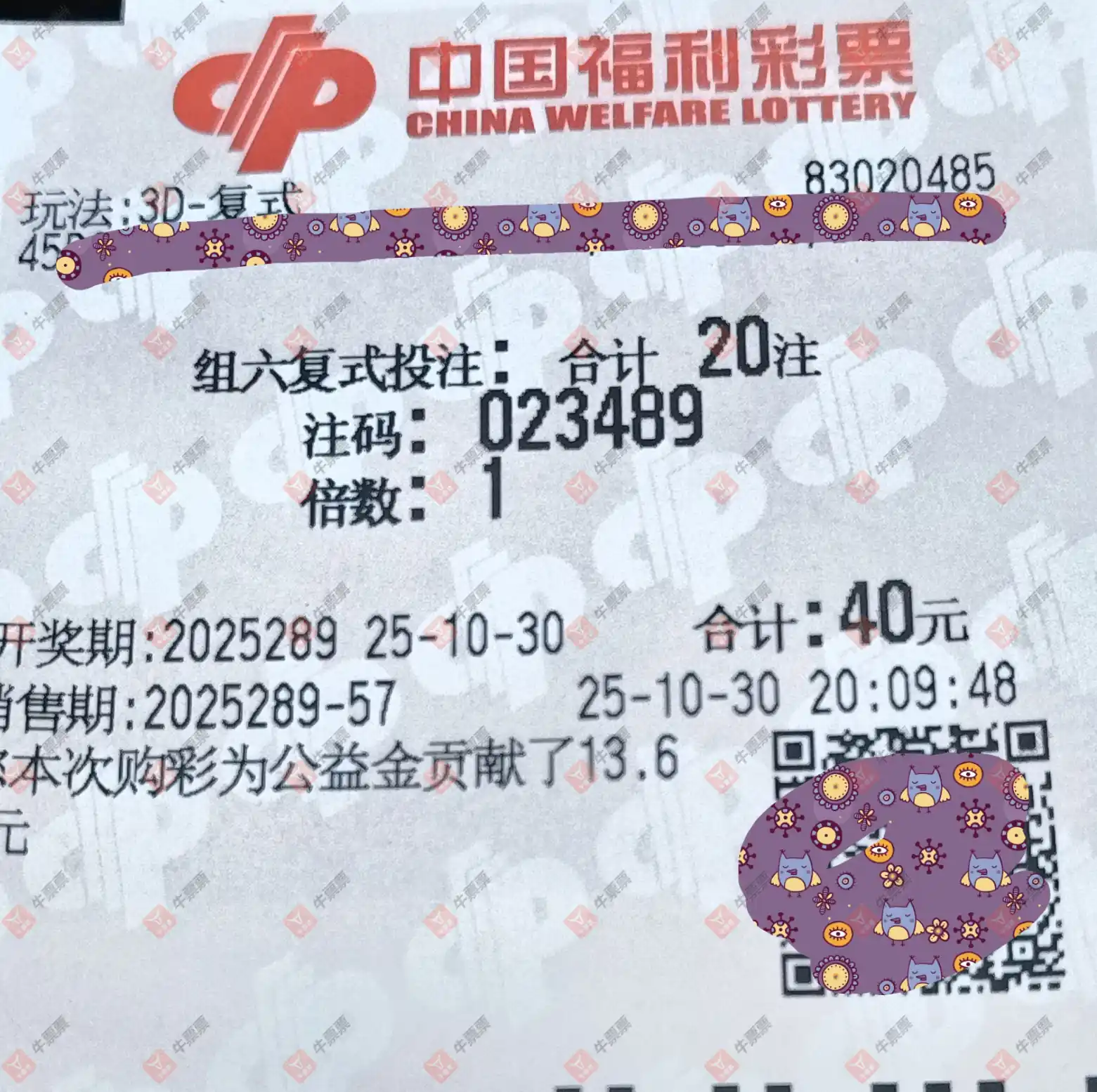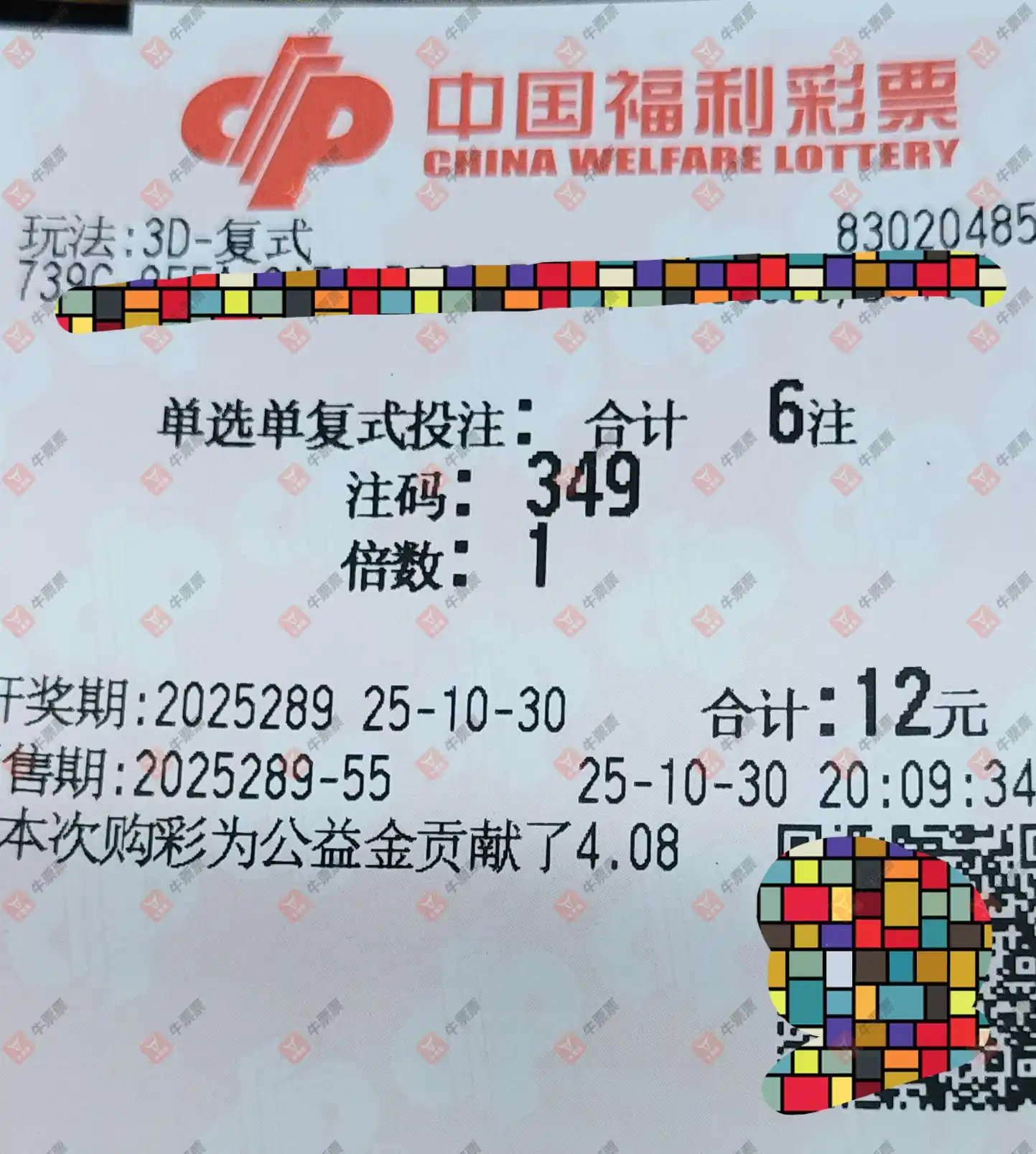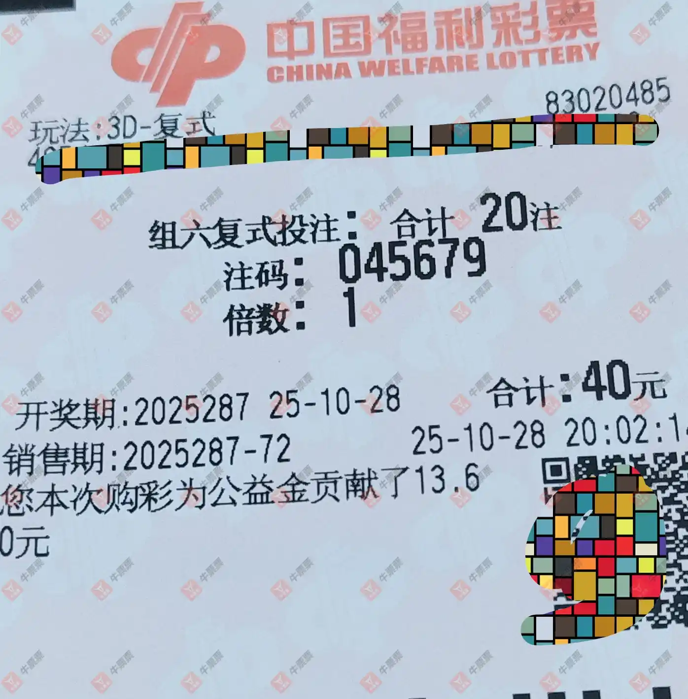 福彩3D 2025287期 晒中