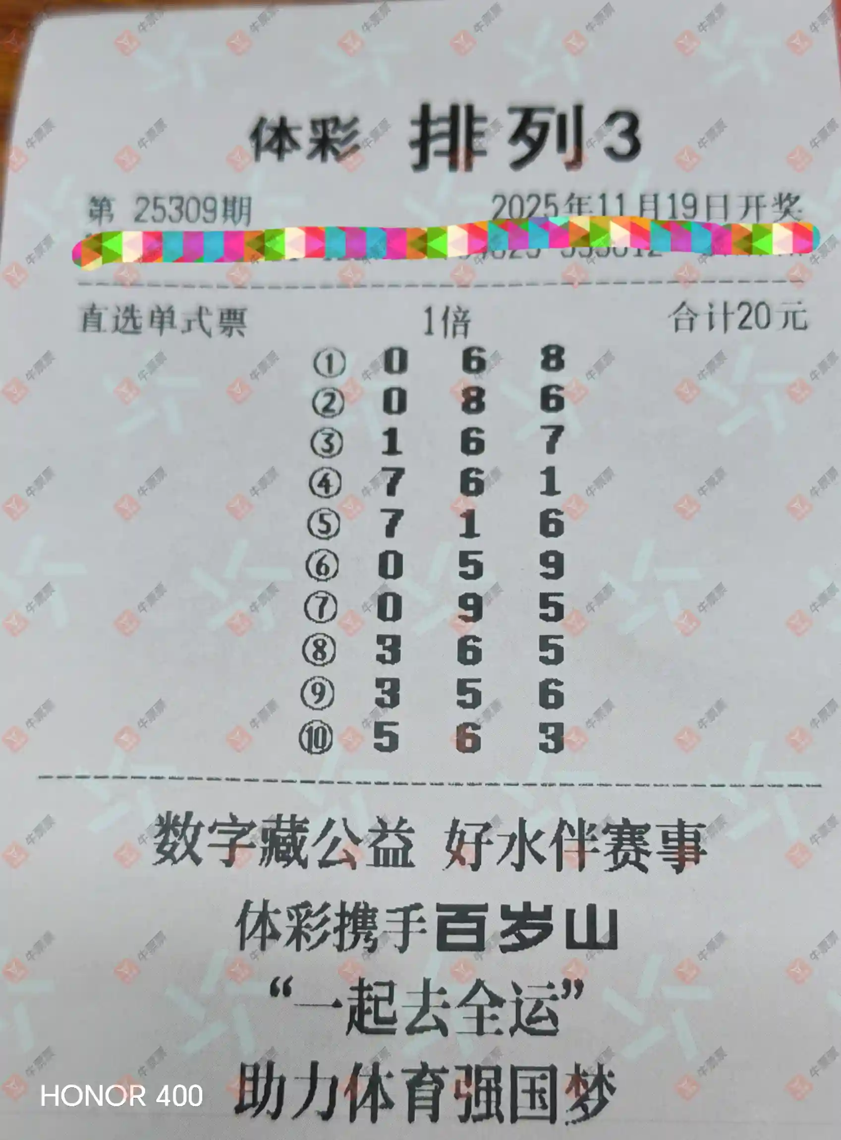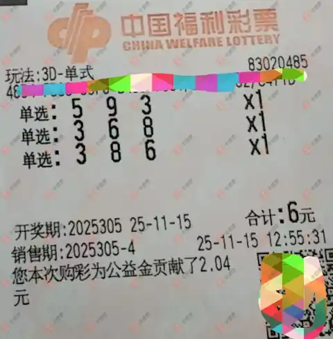 福彩3D 2025309期 晒中