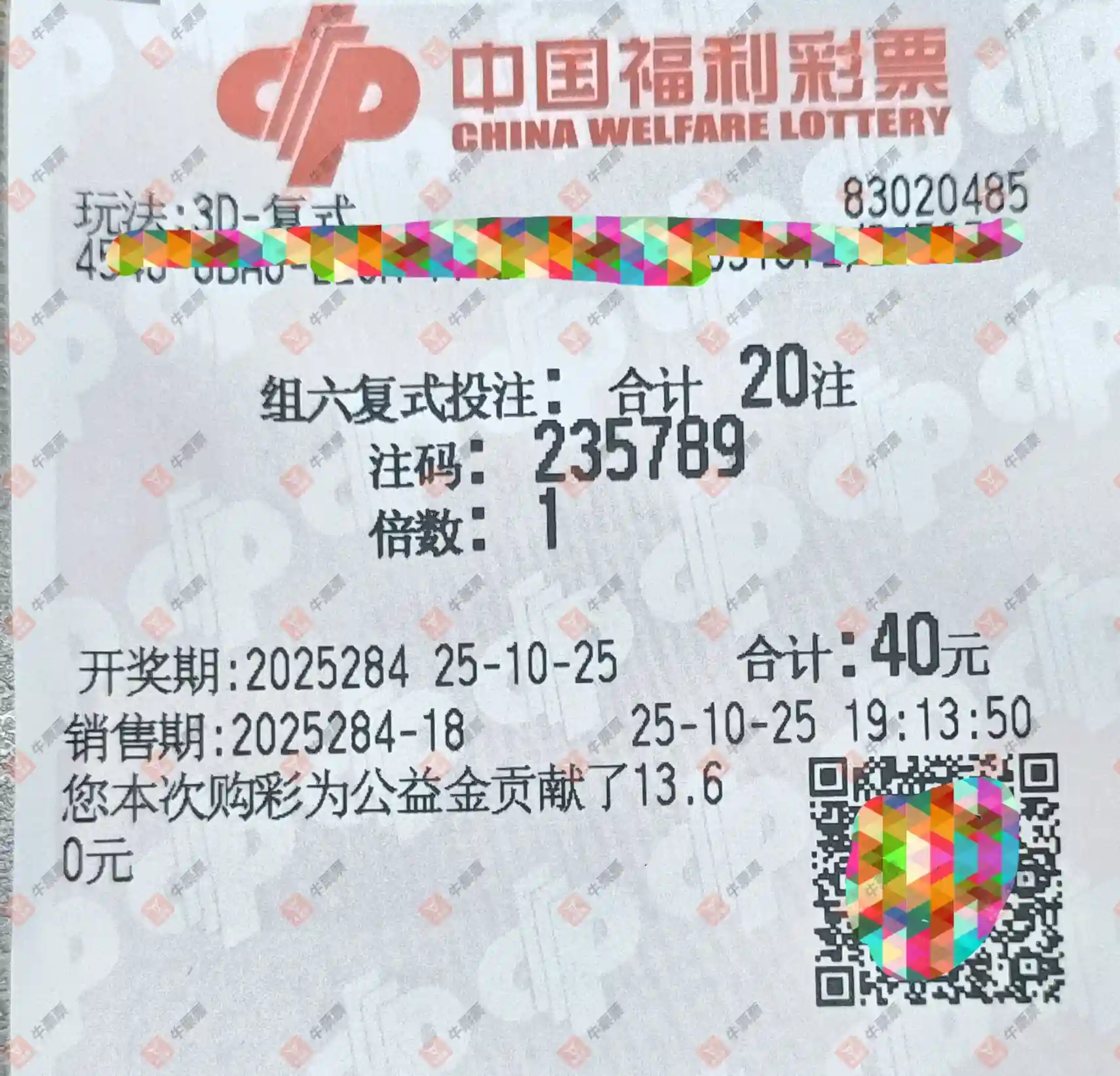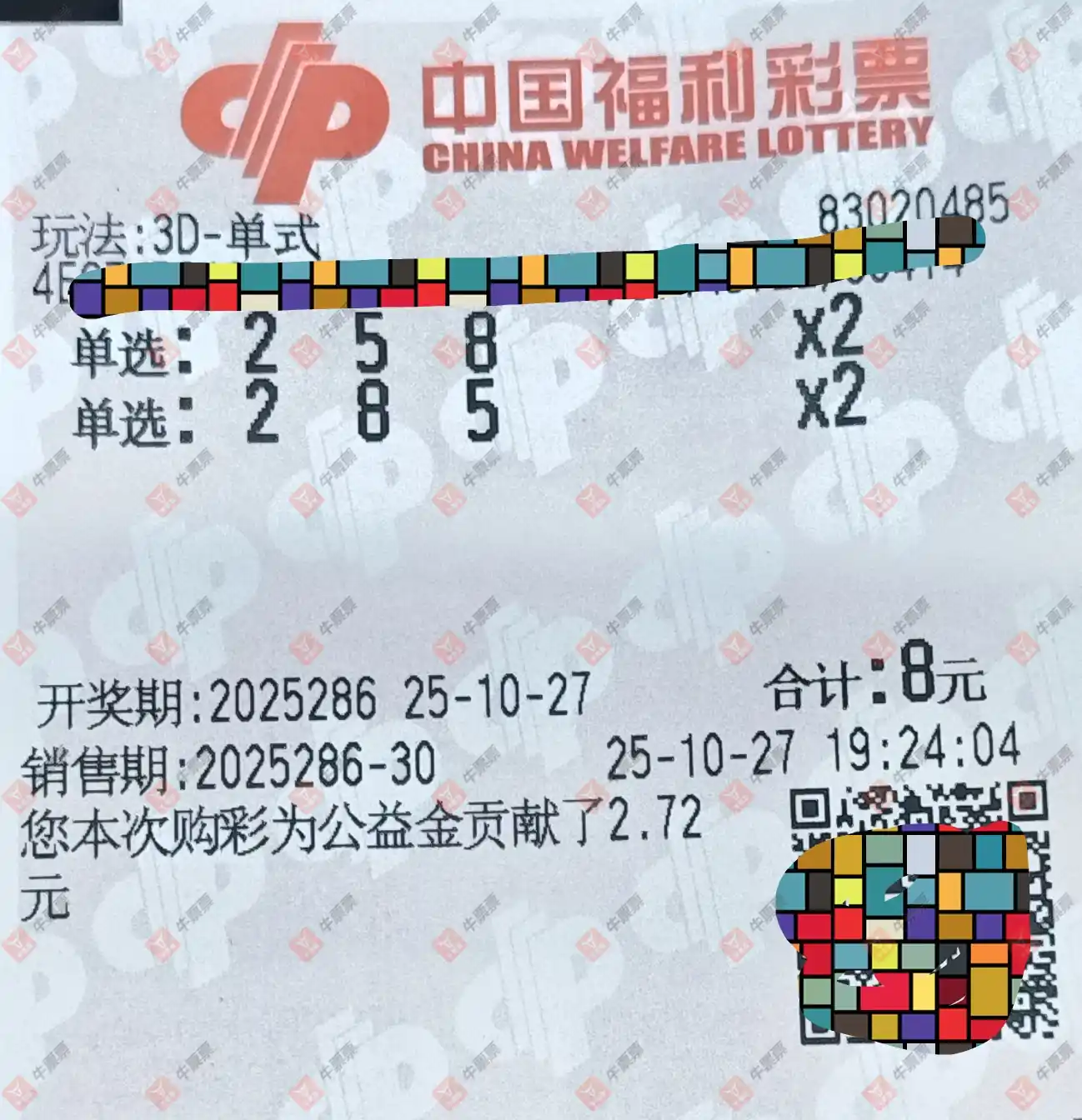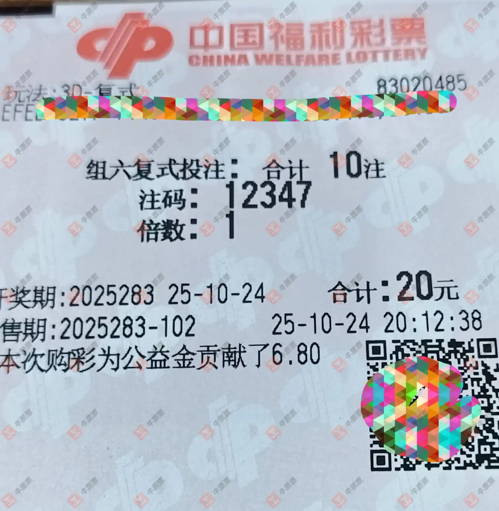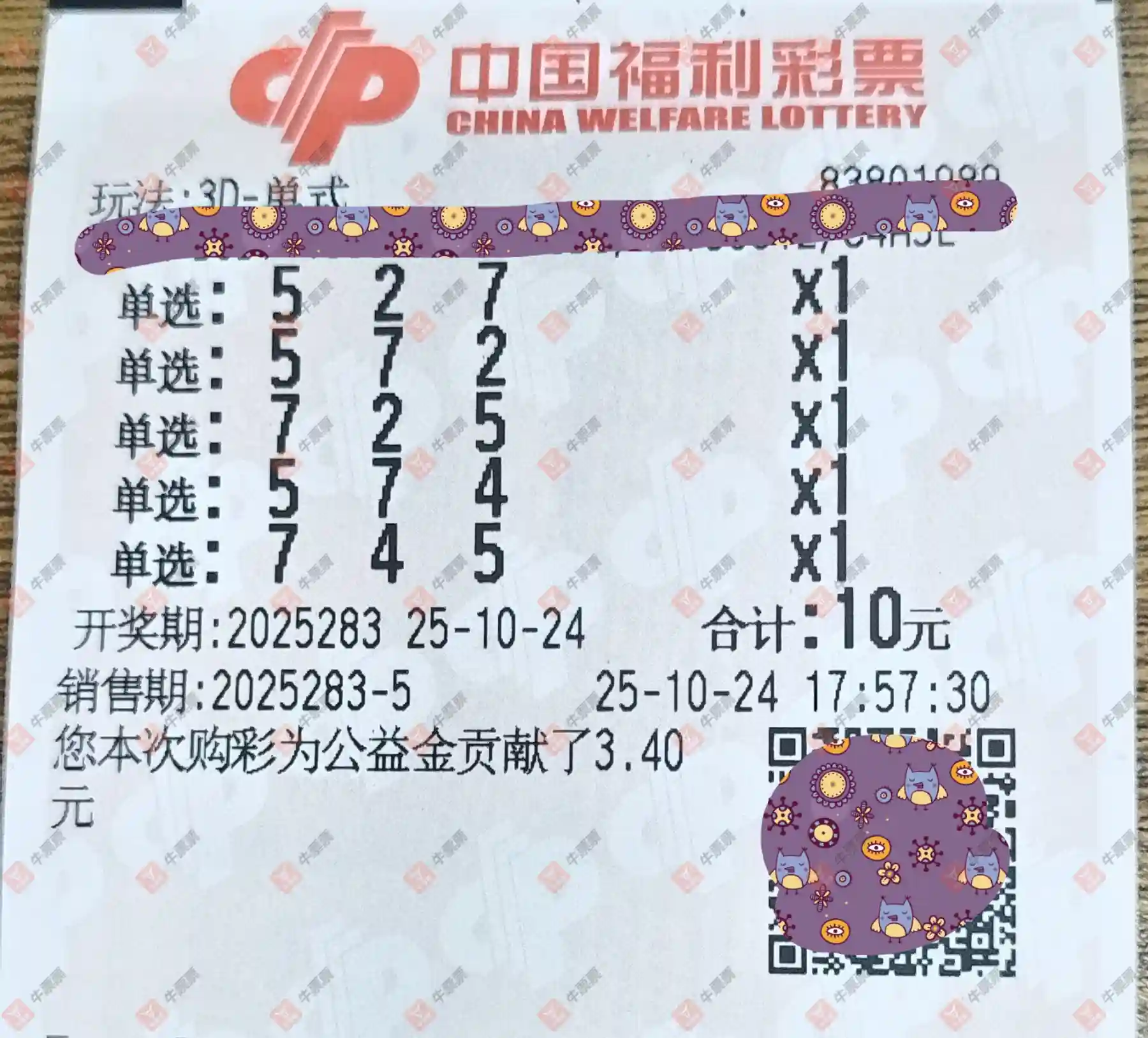 福彩3D 2025283期 晒中