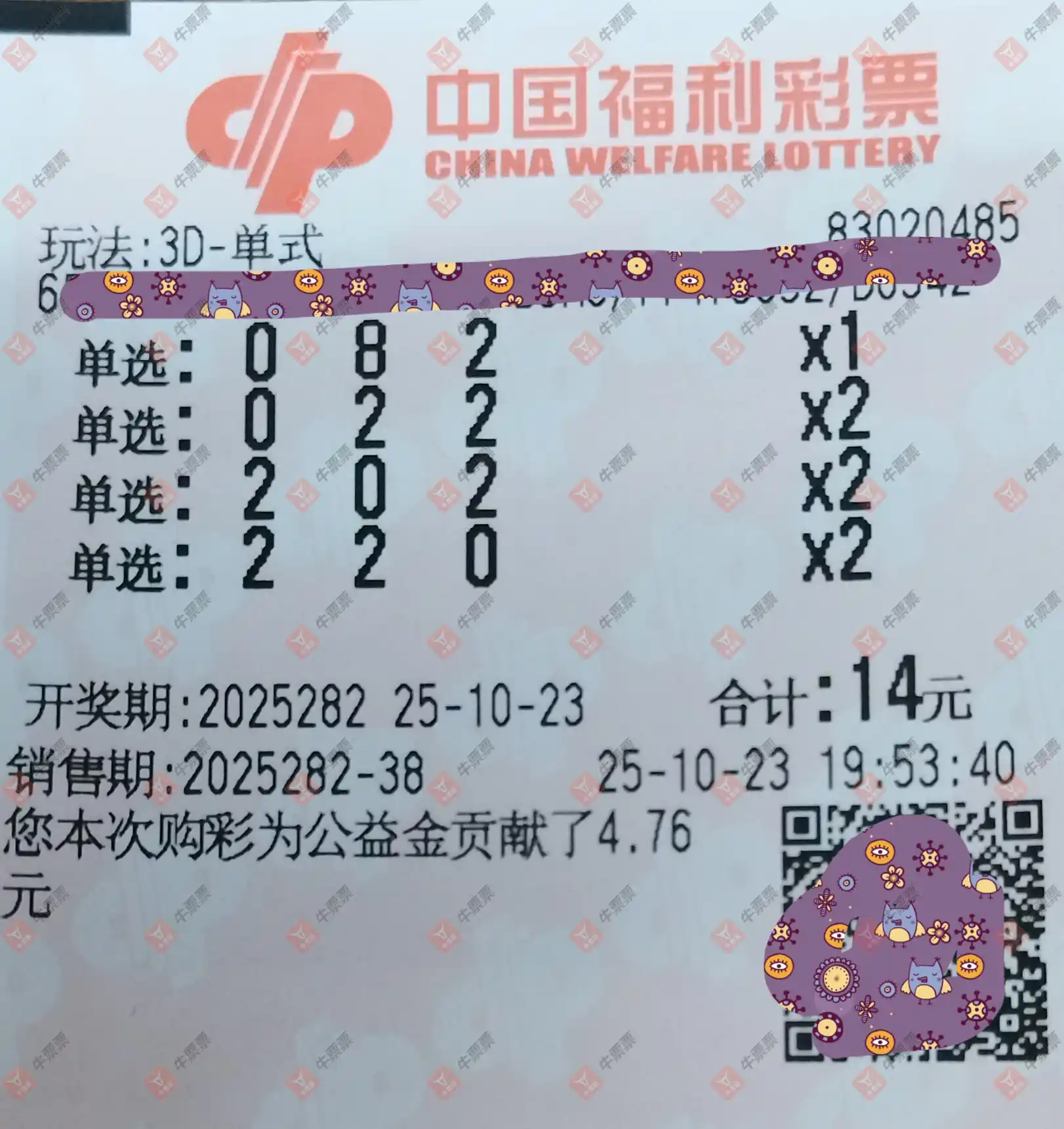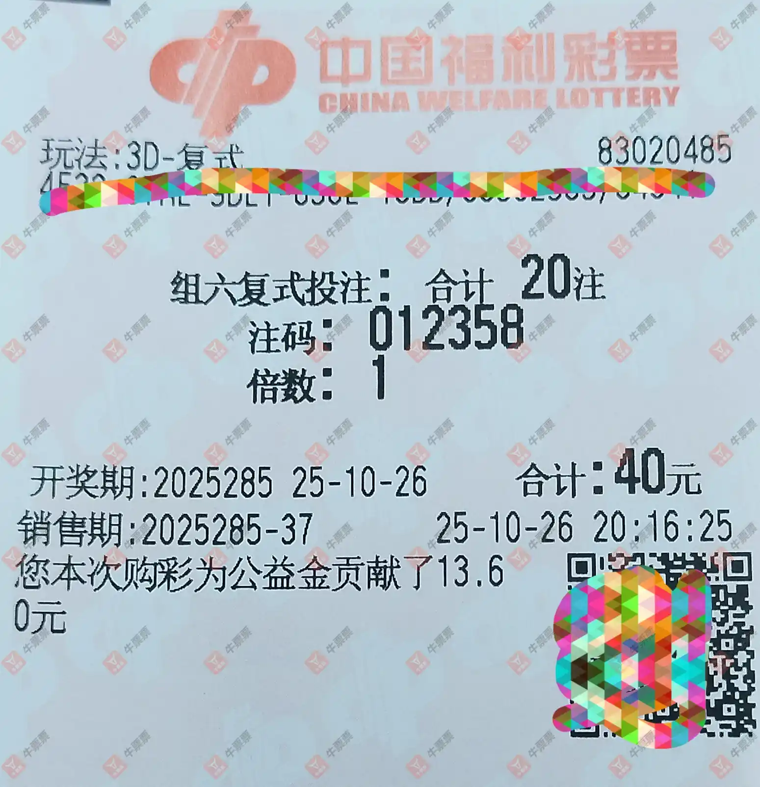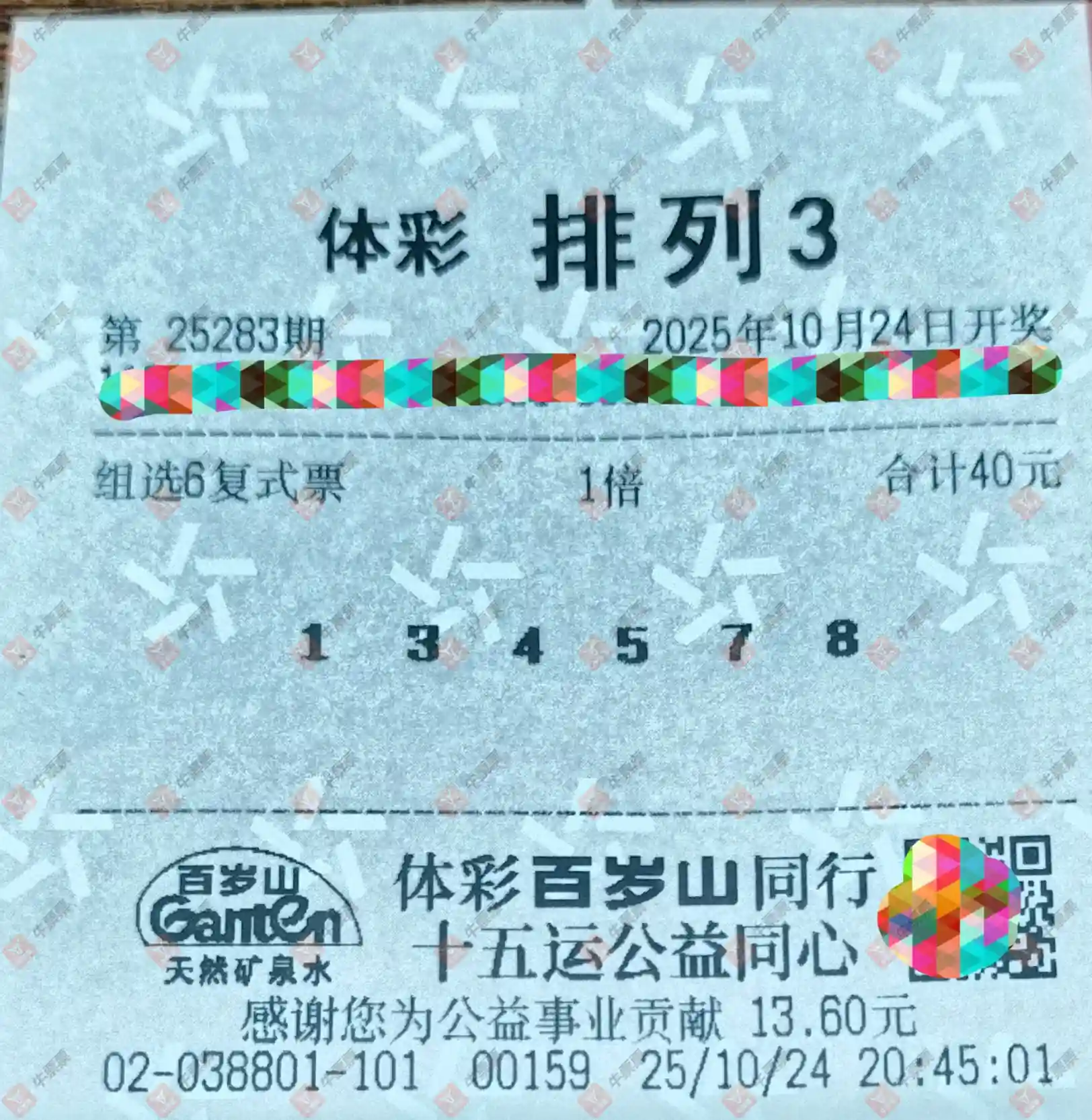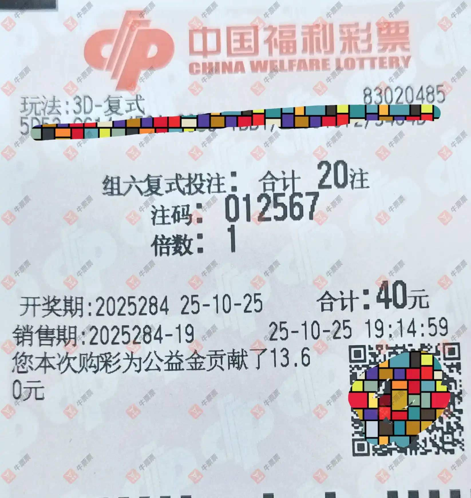 福彩3D 2025283期 晒中