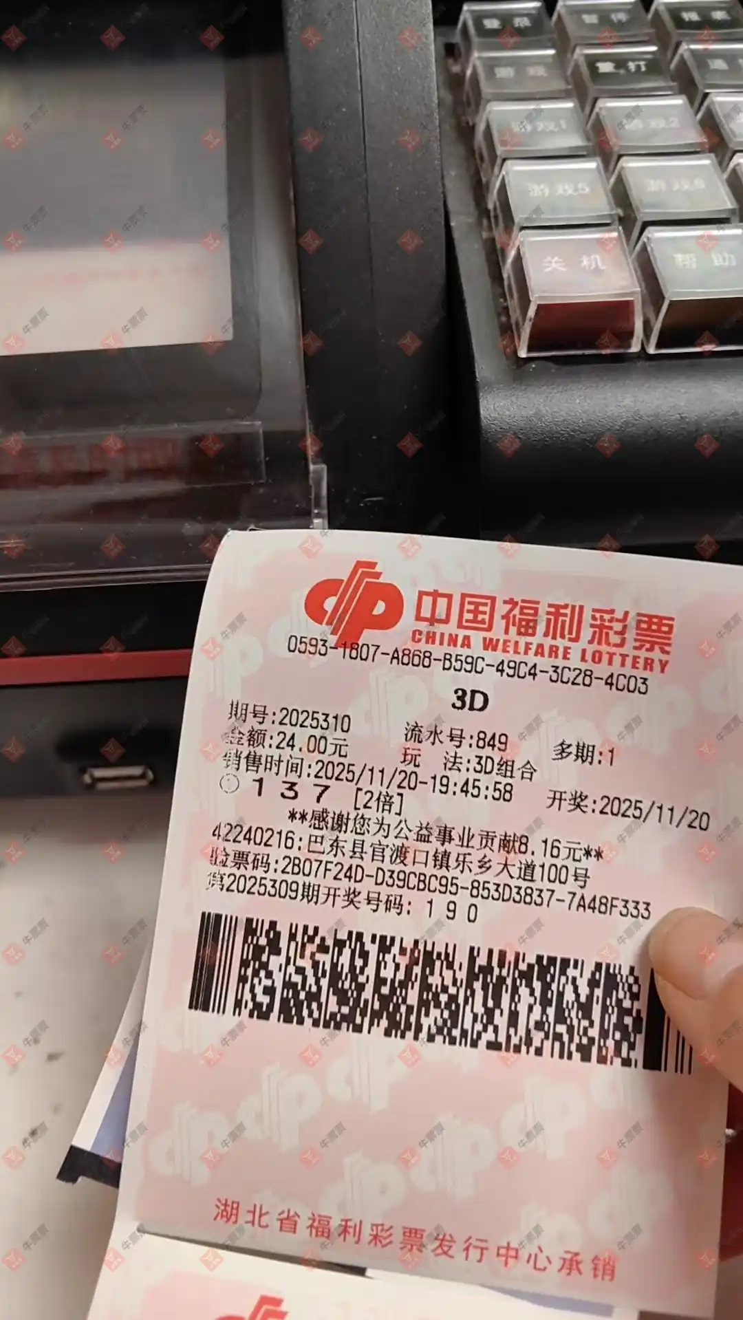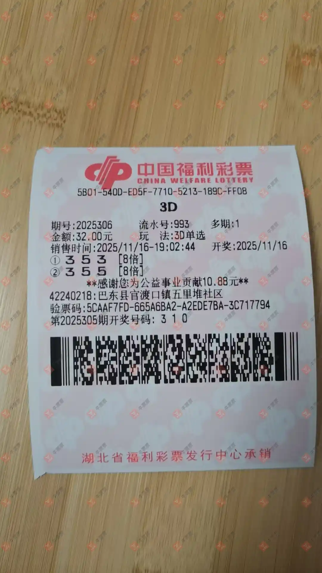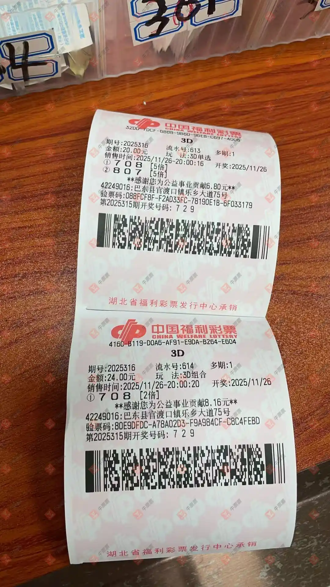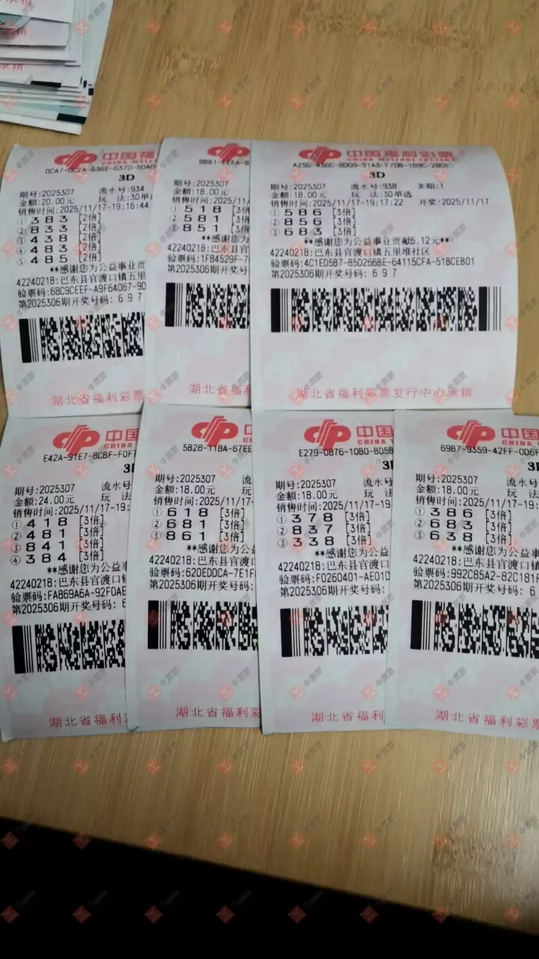 福彩3D 2025307期 晒中