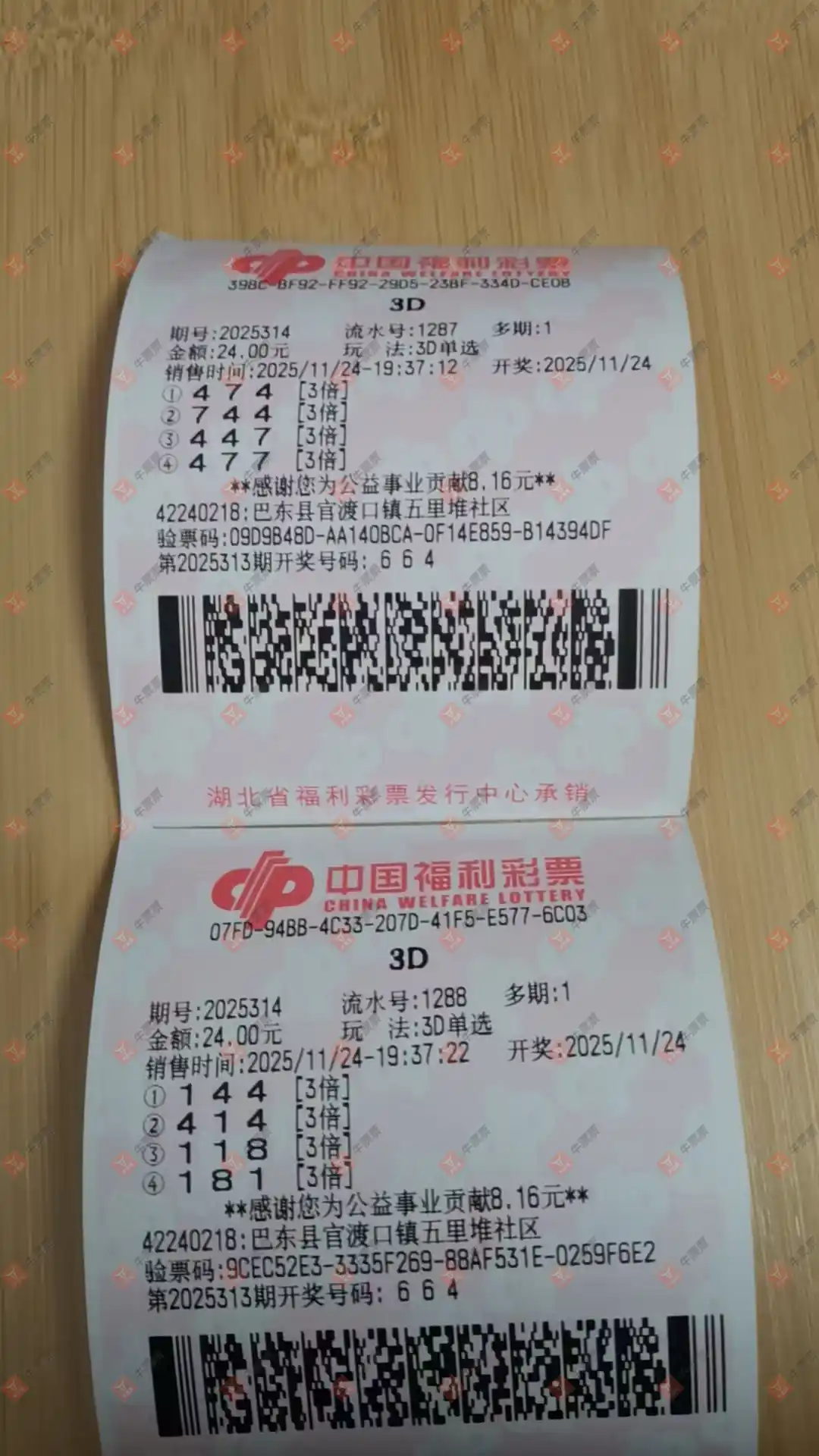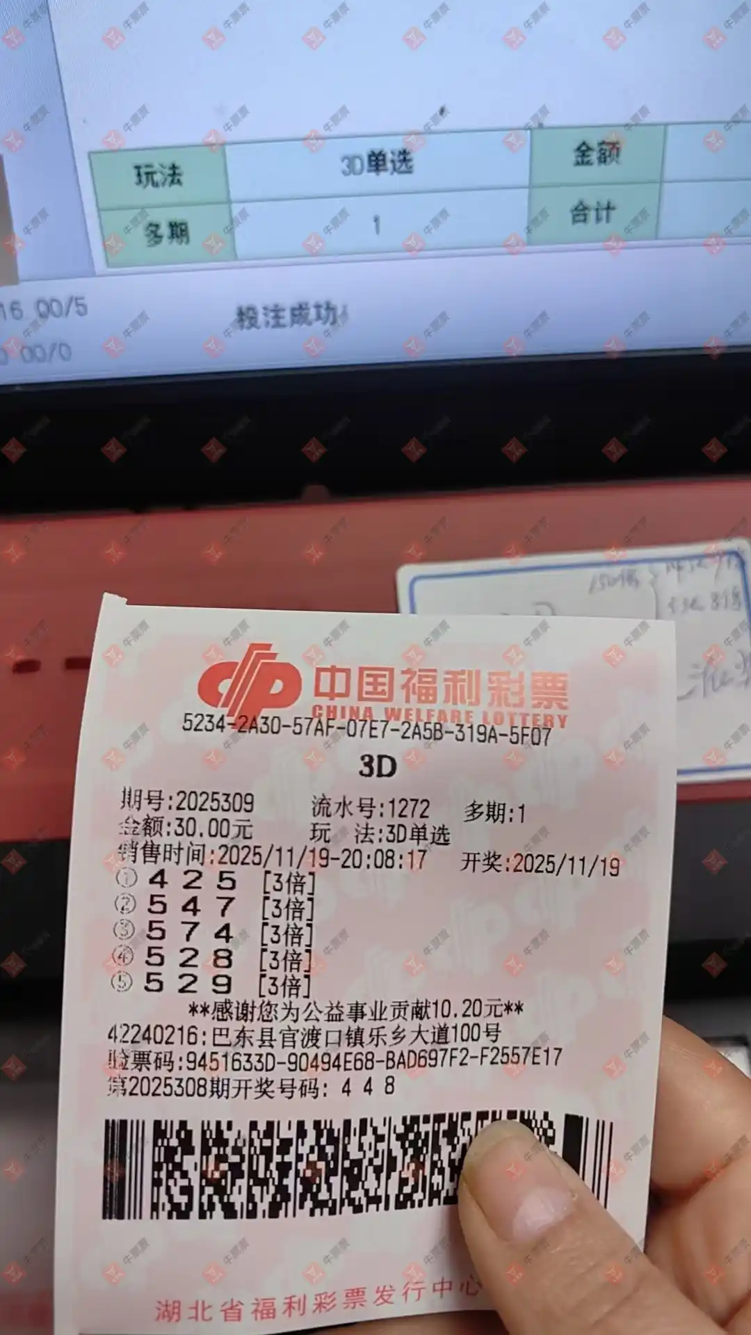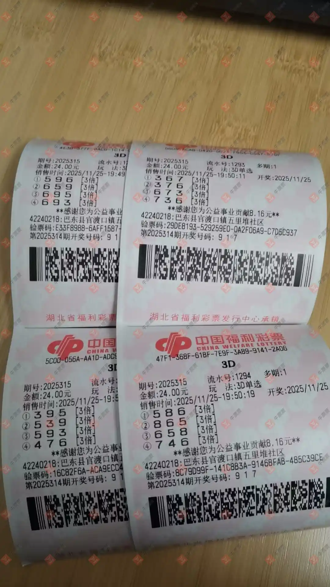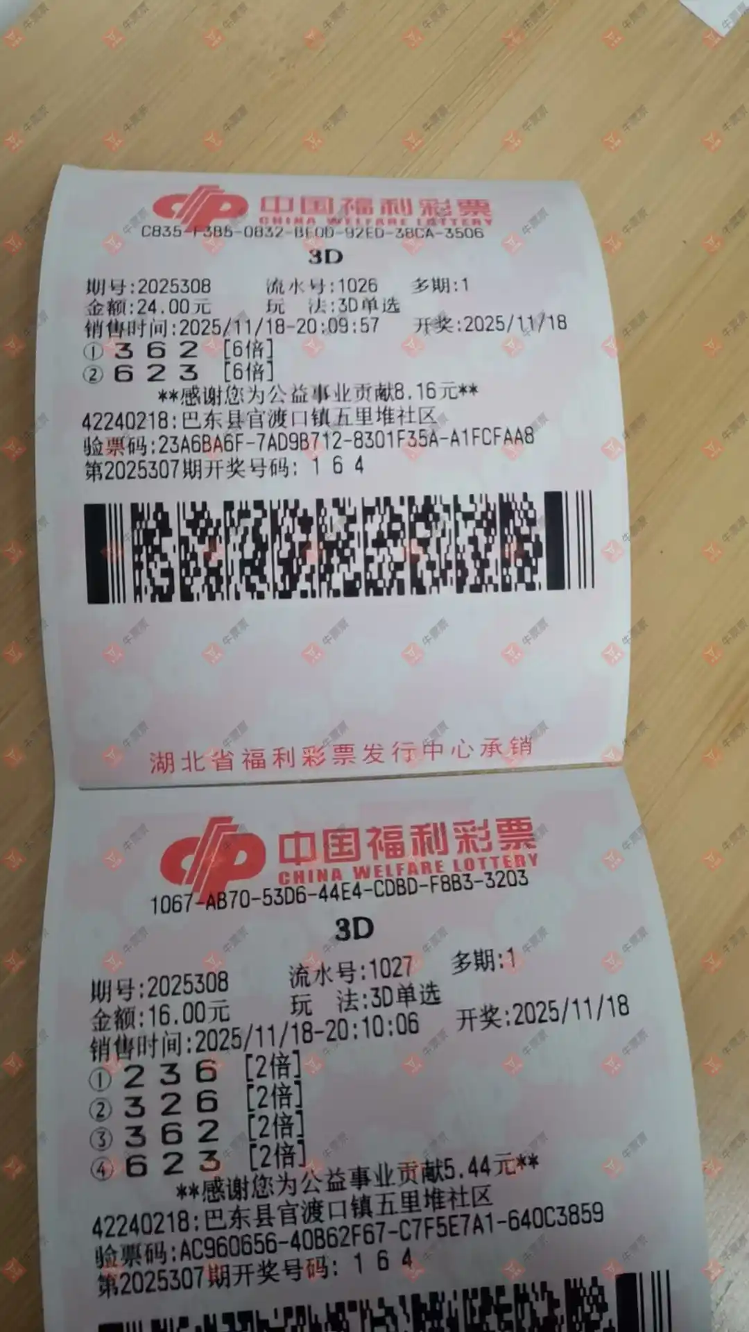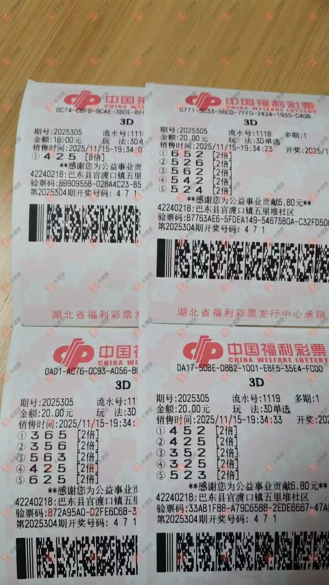 福彩3D 2025307期 晒中