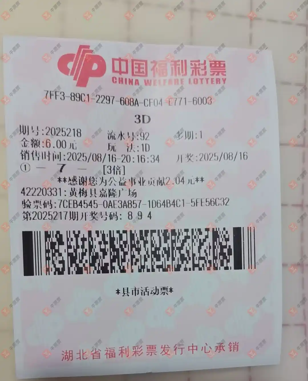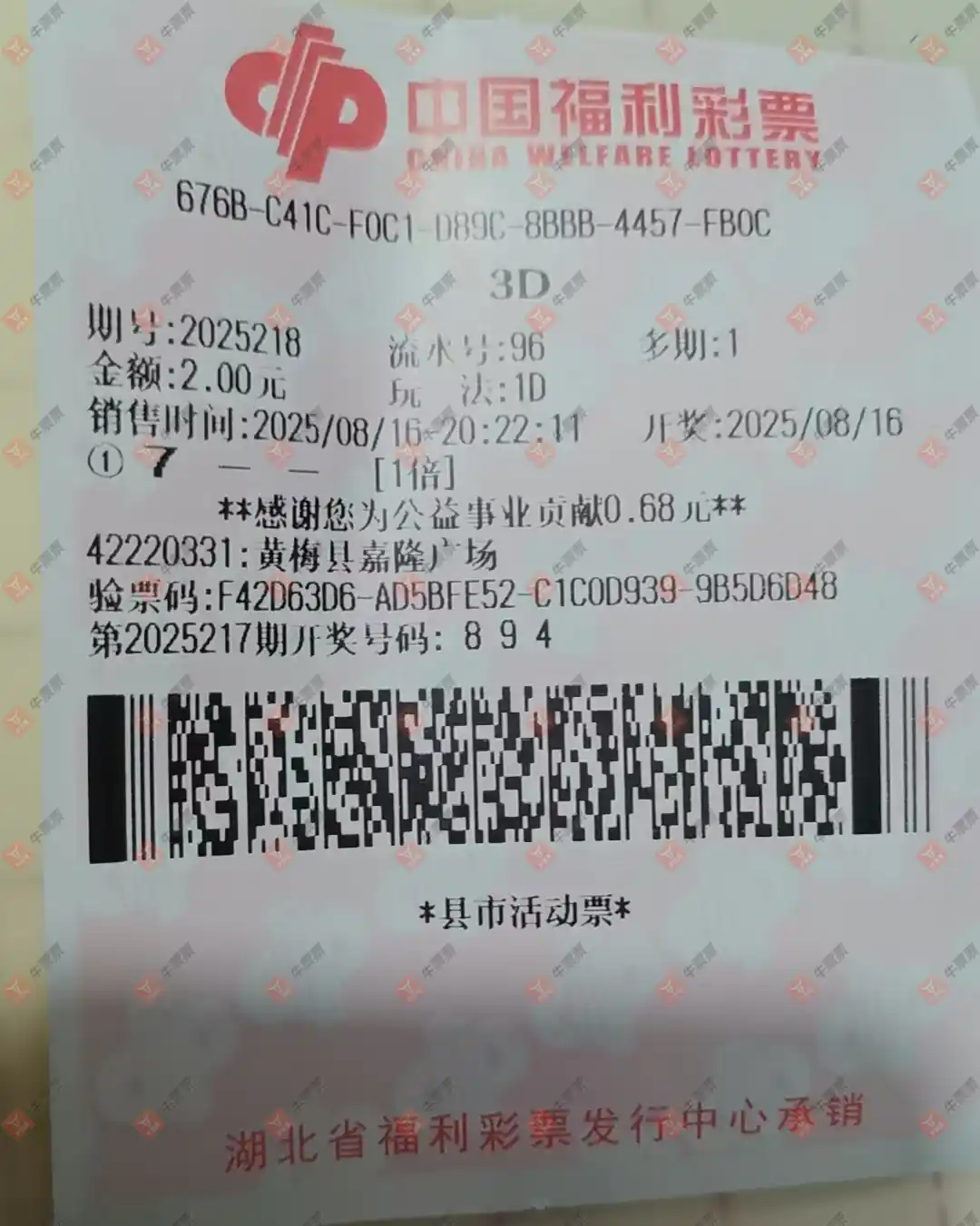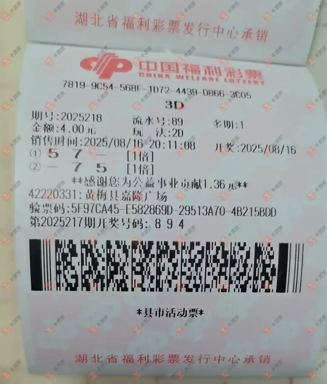 福彩3D 2025219期 晒中