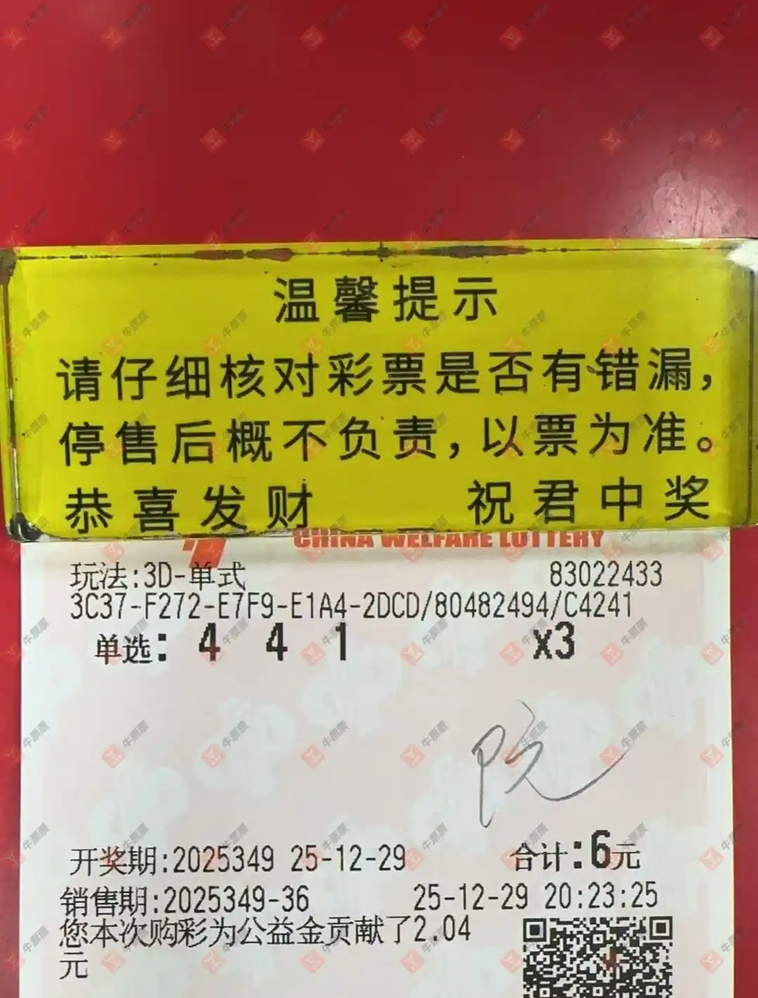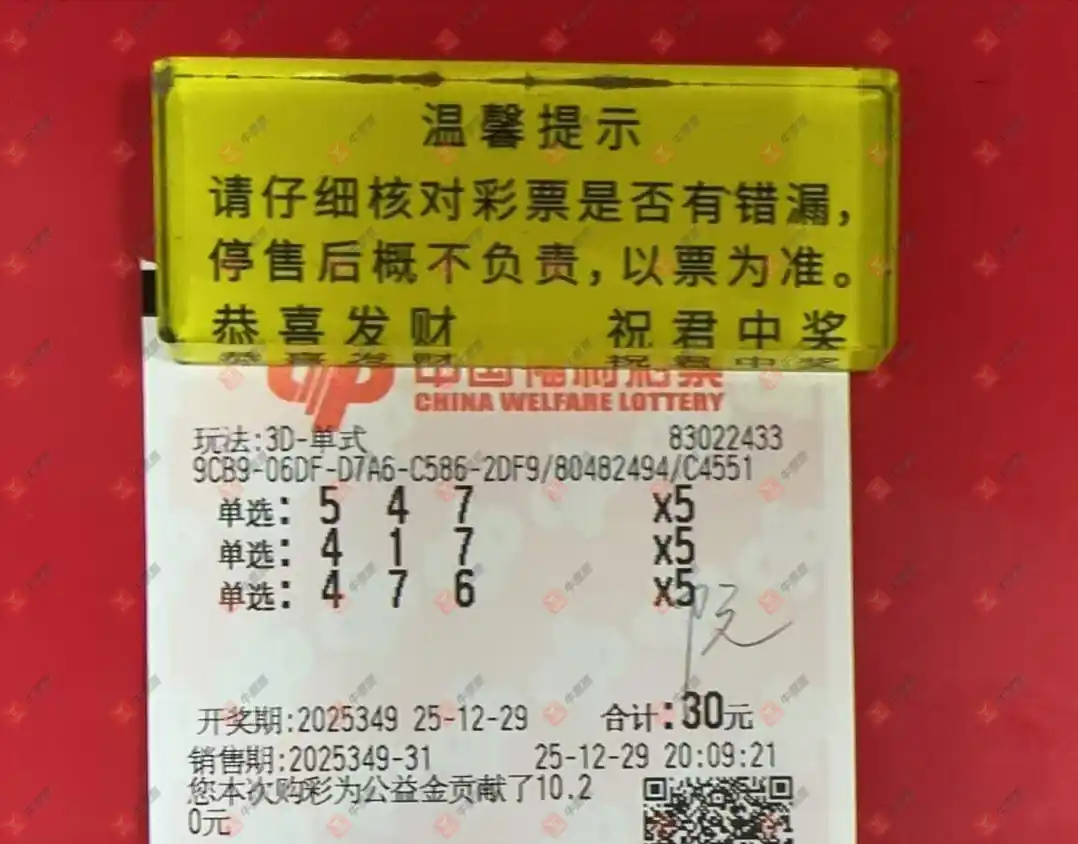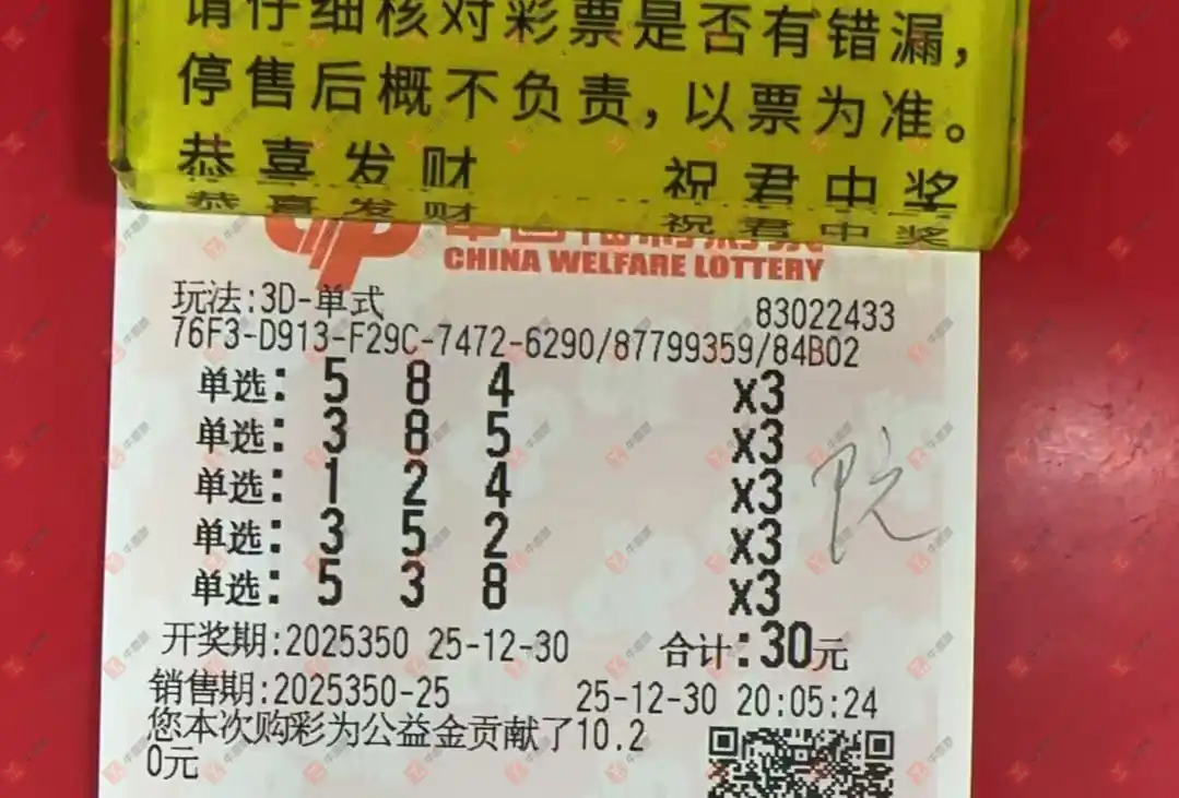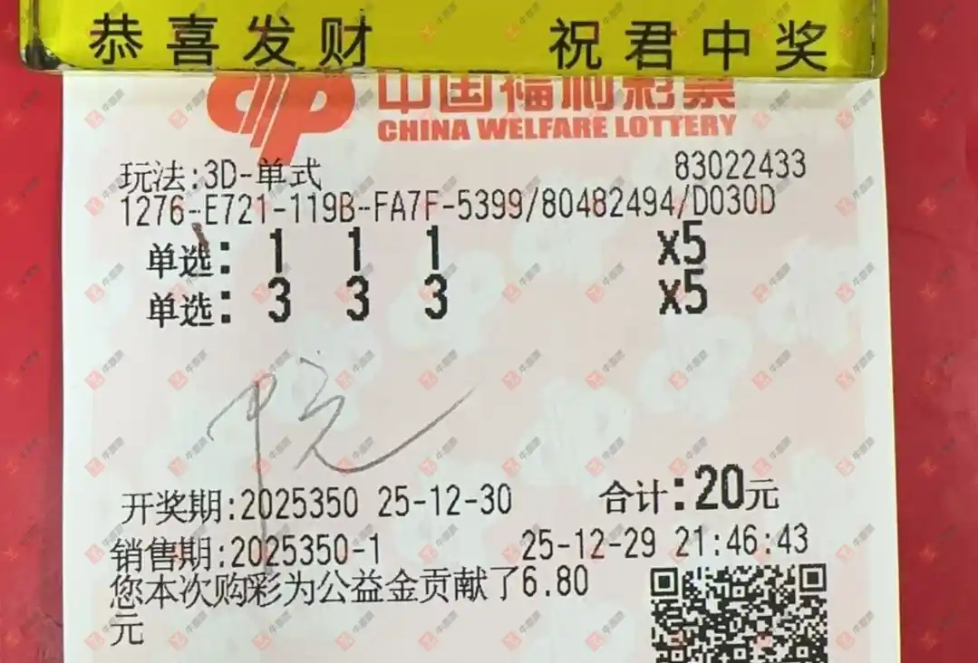 福彩3D 2025351期 晒中